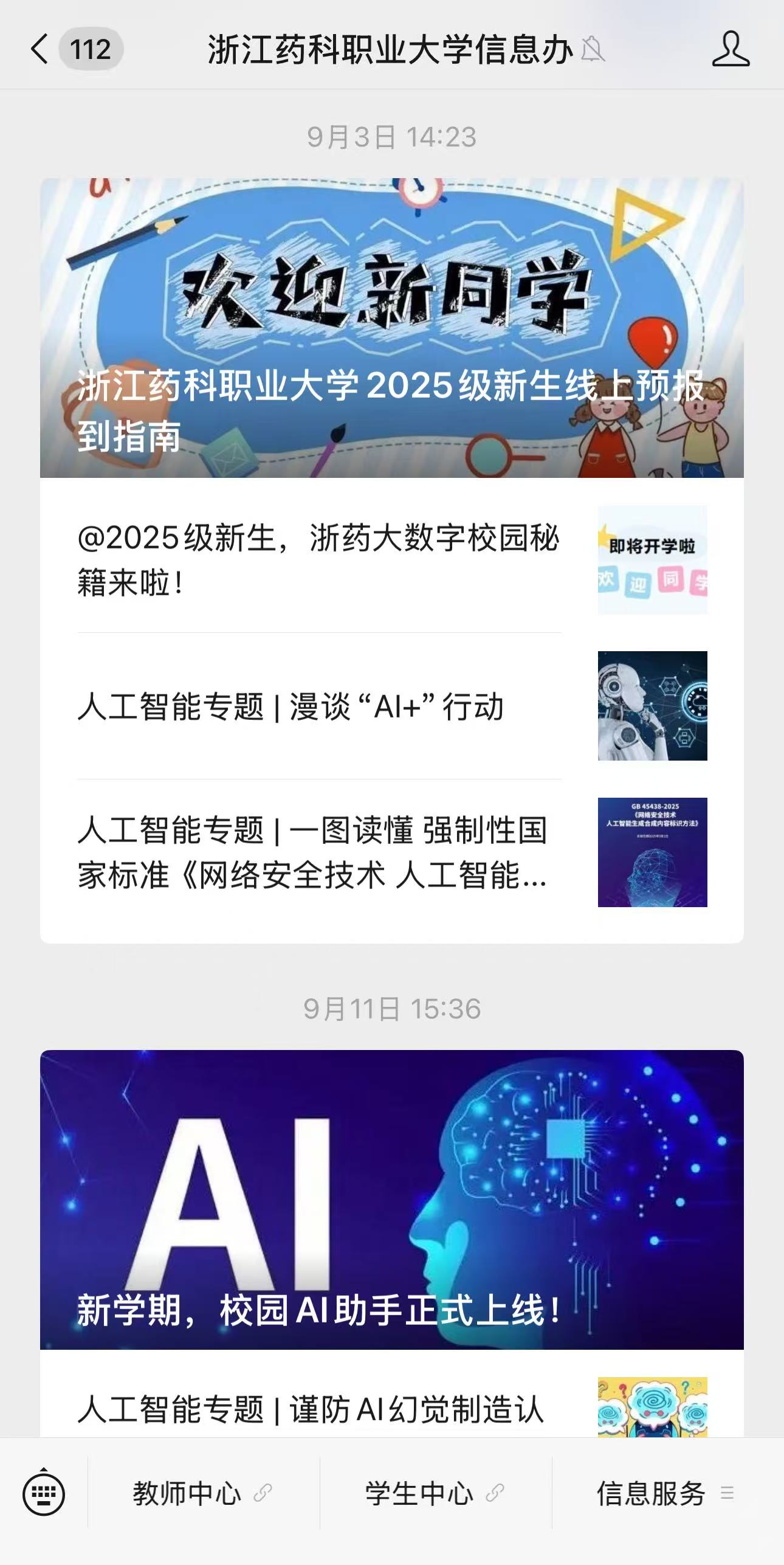 为帮助新生提前熟悉“数字浙药”,9月初,数字与信息中心通过“浙药大信息办”微信服务号推送迎新指南和信息化服务介绍,累计阅读次数超过6400次,有力促进新生对智慧校园生态的沉浸式体验。