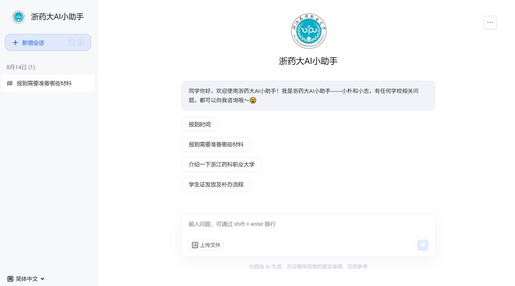 9月11日,数字与信息中心推出基于智能体开发平台与DeepSeek大模型构建的智慧工具——“浙药大AI小助手(小朴与小志)”,作为7×24小时在线的“迎新向导”,为2025级新生提供涵盖“入学准备”至“校园适应”全场景的实时校园咨询。迎新期间,浙药大AI小助手实时解答了涵盖报到手续、校园网络、一卡通、人脸采集、数字校园、学籍管理、应征入伍、预约进校、选课、转专业及后勤生活管理等咨询,共计2000余人次,助力迎新工作的高效有序运行。