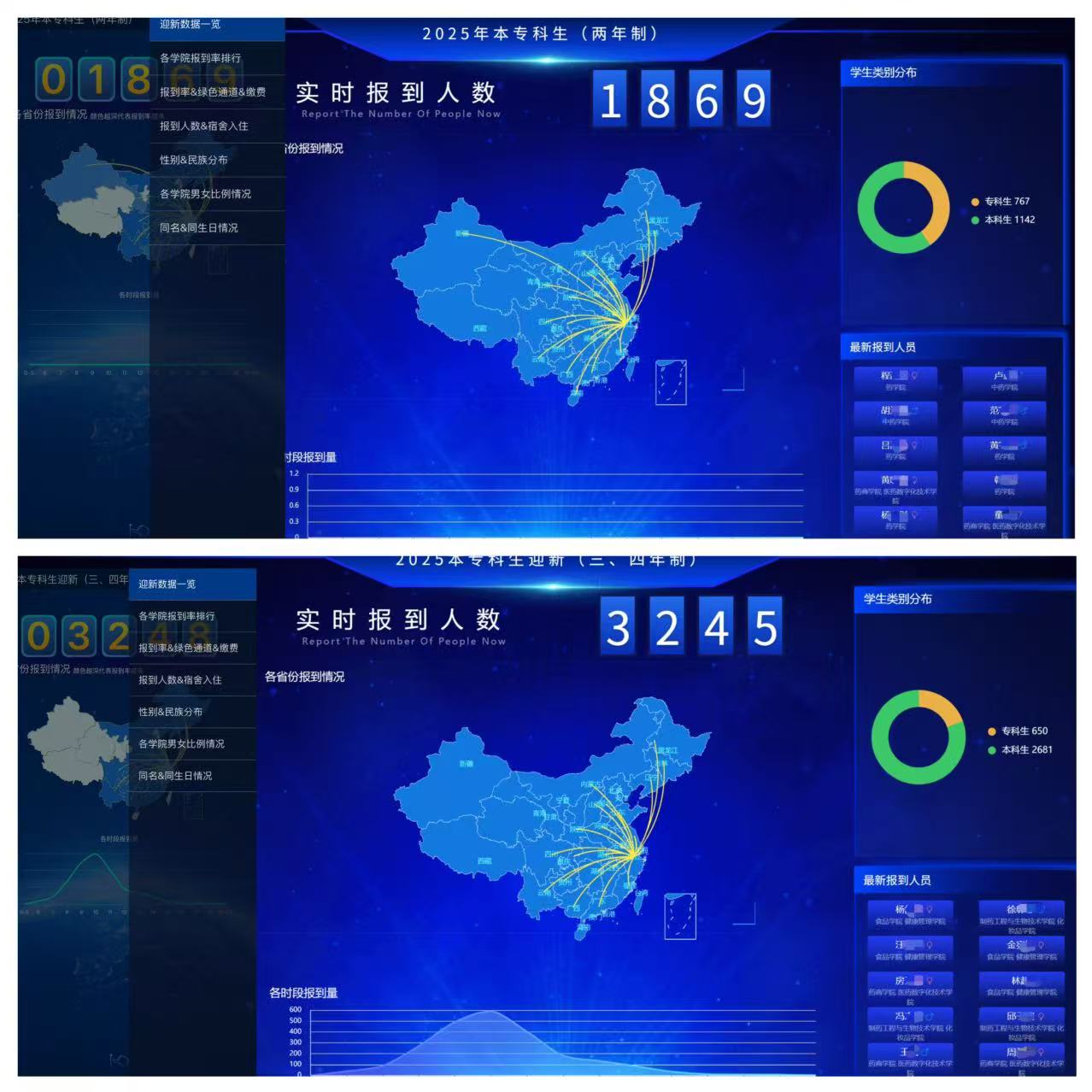 迎新数据可视化大屏化身“决策指挥中枢”,为迎新工作注入强劲时效性,大屏实时、动态呈现新生报到进度,为资源调配与决策提供多维度、高时效的数据支撑,有效协同迎新工作。