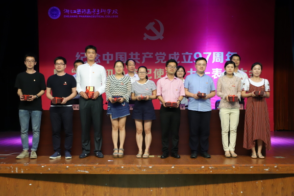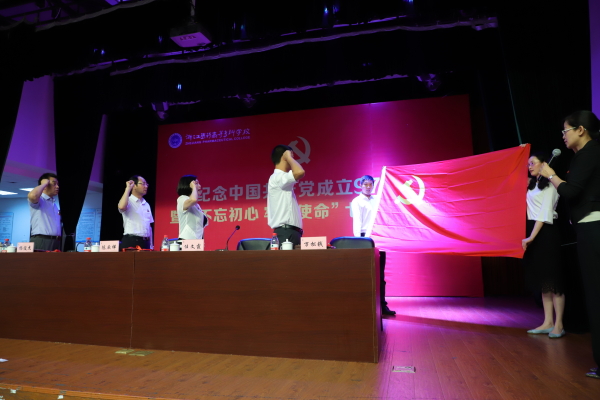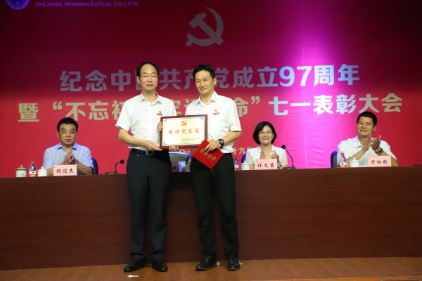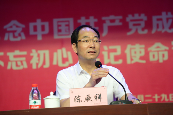 陈厥祥作了题为《传承红船精神 写好奋进新篇》的讲话。他深刻地阐述了“两个一百年”奋斗目标、红船精神以及对学校发展的深刻意义。他指出,近年来,学校党的建设方面始终着眼于党中央“四个全面”战略部署和全面从严治党的工作要求,高度自觉地履行主体责任,协同落实第一责任、监督责任和一岗双责,构建了党建+工作体系,形成了“五型”党组织、“七个一”活动等特色党建品牌,通过组织开展“望道•夜谈”传习行动将“两学一做”学习教育常态化制度化要求全面深入到了每个党支部和全体党员。最后,他提了三点希望:一是要不忘初心、求本开新,在两个一百年目标的接续长征中自觉增强党员的责任感和使命感。行进在升本路上的浙药,要不忘初心,不辱使命,弘扬红船精神,再写奋进新篇,把党员的责任和使命协商学校发展新的里程碑,把以“为人民谋幸福、为民族谋复兴”的旨归写到新的时代答卷之上,把“七个一”意识汇聚成“扩校、升本、创一流”的磅礴力量,把党员为党的事业增光添彩的奋进之笔写上党的旗帜。二是要不忘初心,求本开新,在传承红船精神的学思践悟中努力争当忠诚干净担当的共产党人。“红船精神”是中国共产党的精神之源、精神之基、精神之本。传承和弘扬“红船精神”最根本的就是要彰显中国共产党人忠诚干净担当的品质,始终保持永不懈怠的精神状态和一往无前的奋斗姿态。三是要不忘初心、求本开新,在干事创业的奋进搏击中充分发挥各级党组织的加强领导核心作用。党的领导体现在领导人民干事创业中,体现在发挥全面领导、政治核心、战斗堡垒和先锋模范作用中,体现在为人民创造美好生活、办人民满意教育、建设高等教育强国的实际行动中,体现在着力培养德智体美劳的社会主义建设者和接班人的教育教学实践中。