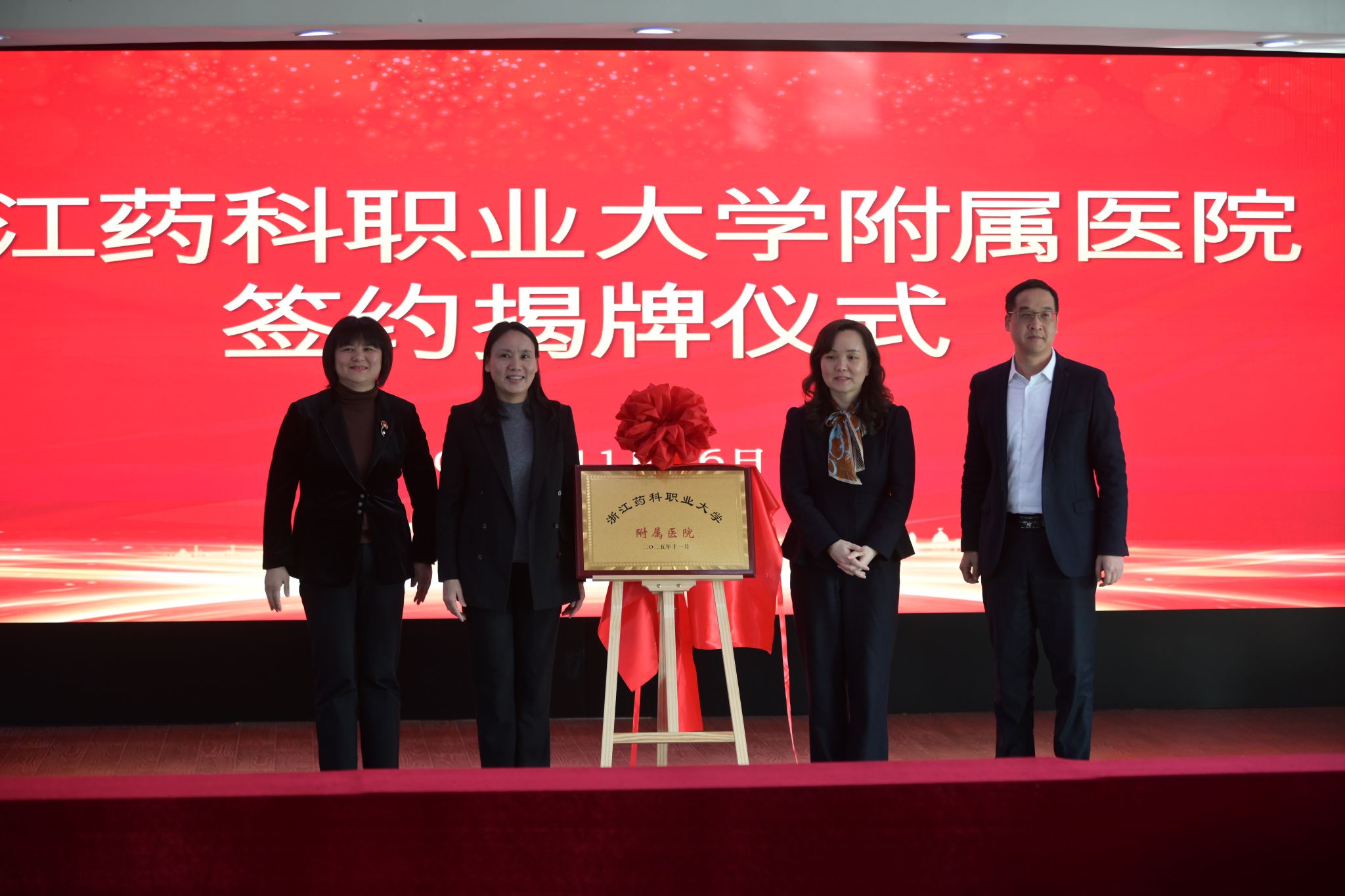 随后,庞超静与阮叶萍共同为“浙江药科职业大学附属医院”揭牌。这一历史性时刻,标志着校院合作正式启航,现场响起热烈掌声。