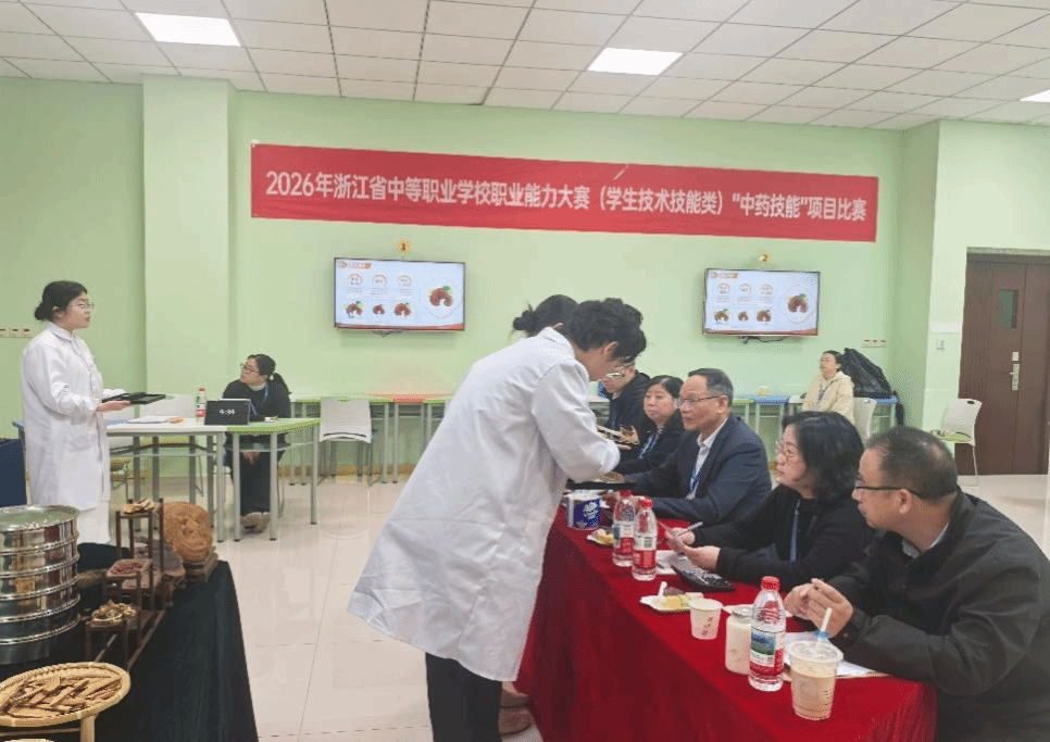 为深入贯彻全国职业教育大会精神,扎实推进中医药职业教育“岗课赛证”融合育人,助力中医药领域高素质技术技能人才培养。4月11日,2026年浙江省中等职业学校职业能力大赛“中药技能”项目比赛在我校成功举办。来自全省各地市的十三支中职代表队齐聚我校,以技会友、以赛促学,全面展现新时代中医药学子的精湛技艺与职业素养。