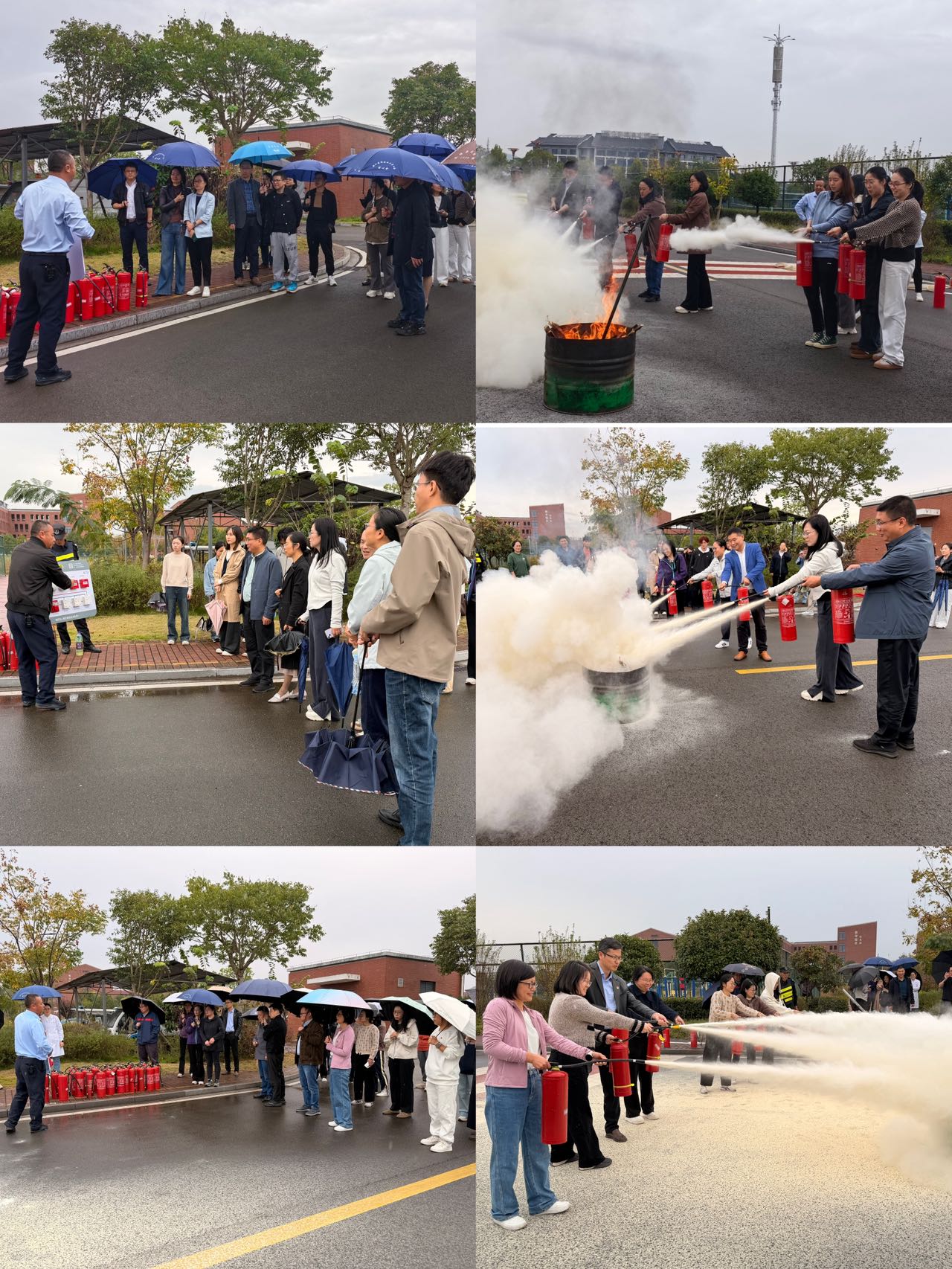 在活动现场,安全保卫部、物业公司相关专业人员结合报警器等模型,系统讲解了火灾报警流程及设备使用方法,并针对干粉灭火器操作、消防栓水带连接与喷射等关键技能进行现场分解演示,参训人员通过实物演示与互动问答,掌握了“提、拔、握、压”的灭火器使用口诀和基础消防知识。在灭火实操演练环节,大家分组进行灭火器使用、消防栓水带连接等训练,确保每位参训人员都能熟练掌握灭火技能。