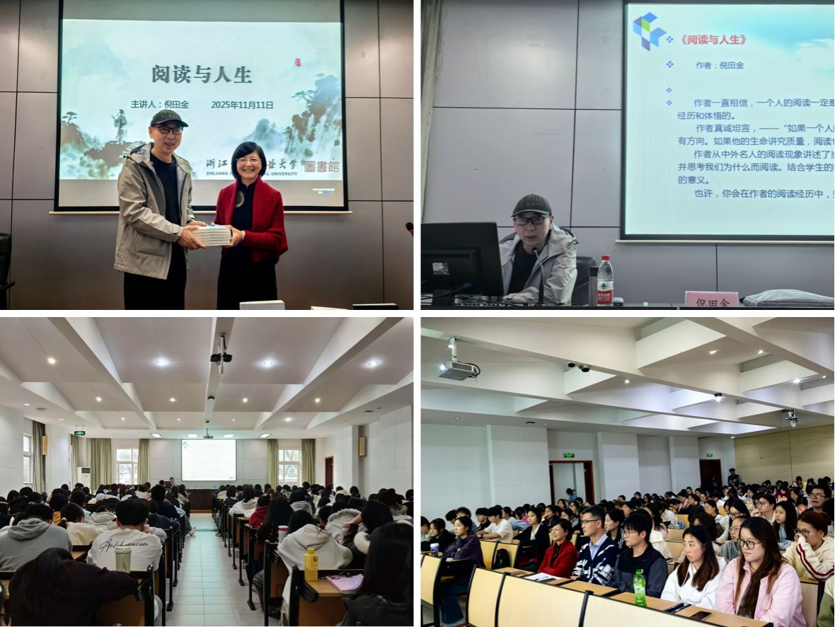 2025年11月11日下午,由浙江药科职业大学图书馆与校读者协会联合主办的《阅读与人生》主题讲座在鄞州图书馆一楼报告厅成功举行。中国作家协会会员、浙江药科职业大学研究员倪田金担任主讲人,全校200余名师生齐聚一堂,共赴一场关于阅读与成长的思想盛宴。