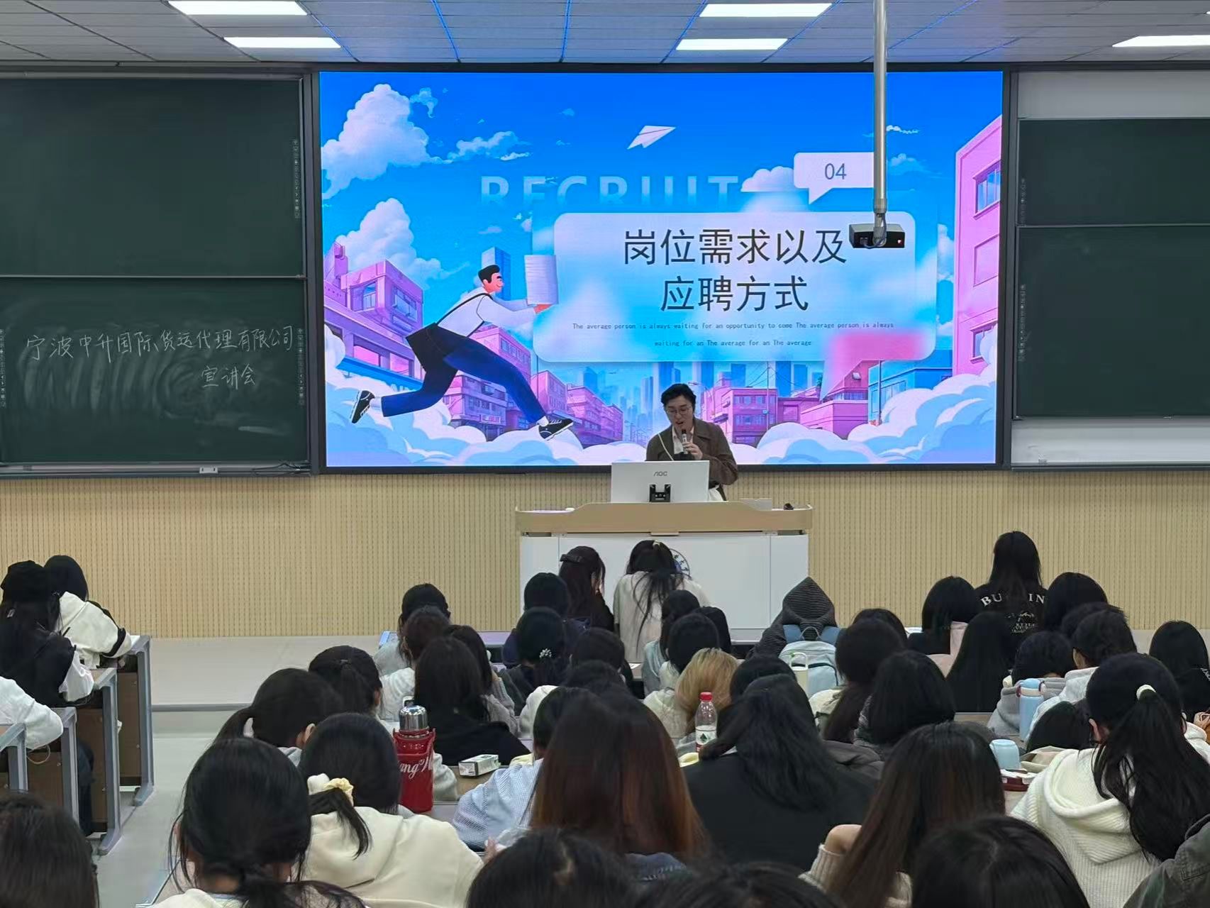 13:45,宁波中升国际货运代理有限公司接棒登场。中升国际公司核心业务包括各种货物的国际代理运输,集海运、空运、陆运为一体,报关、报检、保险、仓储、进出口贸易代理、进口货物的分拨、配送、仓储等服务。企业宣讲师通过展示国际物流的职业可塑性和多位“优秀销冠”吸引众多学子摩拳擦掌,并通过丰富多彩、生动活泼的企业福利展示引发学生热烈互动。