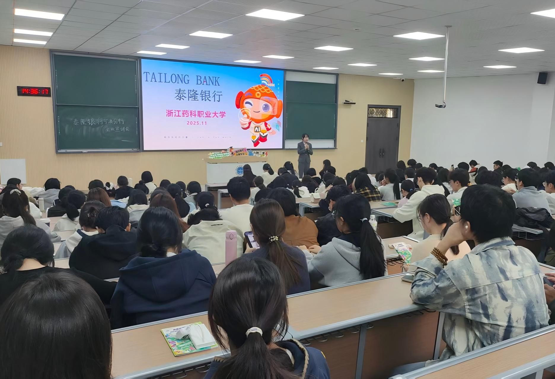 14:30,浙江泰隆商业银行股份有限公司宁波分行压轴亮相。宁波分行人资经理首先通过泰隆银行吉祥物“敖润”充分调动宣讲会气氛,以“小微金融探路者”身份,阐释泰隆银行“服务小微、服务社区”的使命担当。伴随着时代的发展,泰隆银行现已居于全球银行排名第316位!泰隆银行的AB福利、六险二金、百万年薪、不限专业等关键词,燃爆现场,多位学生主动参与互动,现场交流有关对金融业的印象、职业规划困惑等。