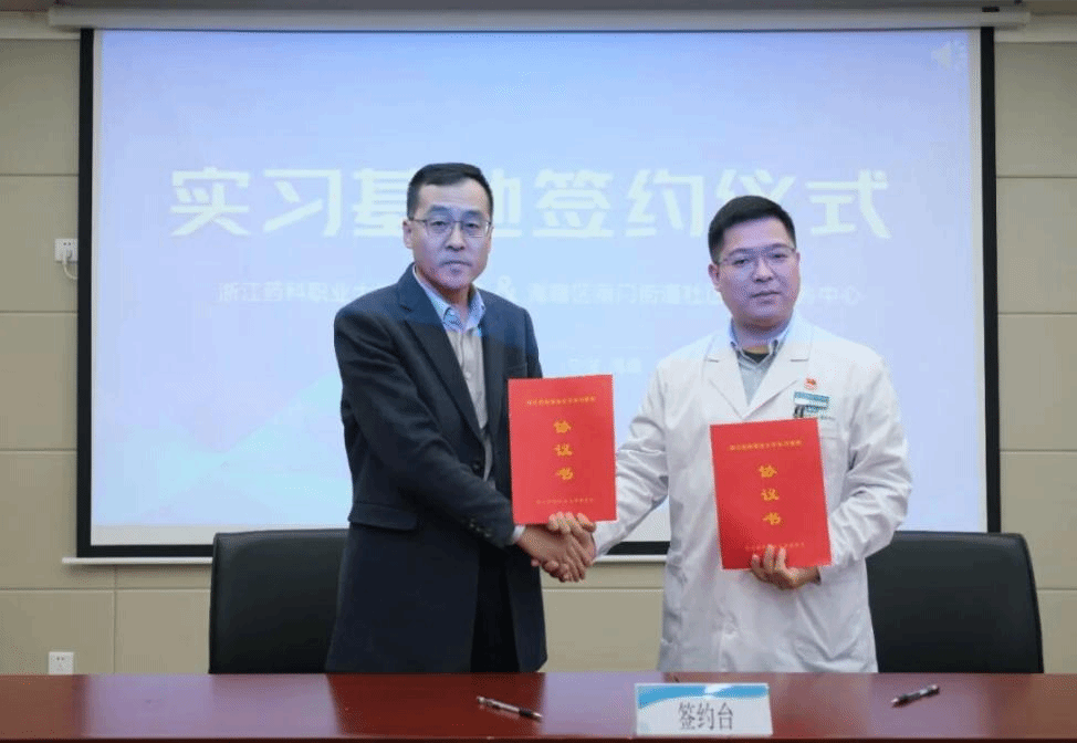 图1:阮洪生与吕鑫春共同签署《浙江药科职业大学实习基地协议书》