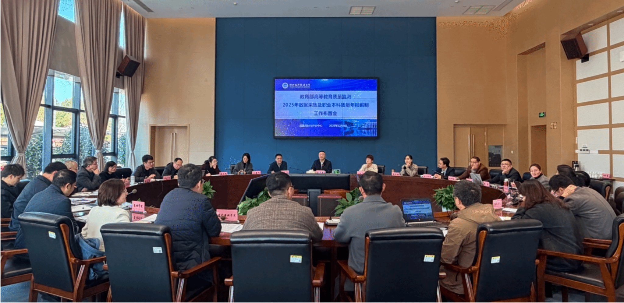 12月9日上午,学校在奉化校区113会议室召开教育部高等教育质量监测2025年数据采集及职业本科教学质量报告编制工作布置会。办公室、组织部、发展规划处、人事处、学工部、教务处、科研处、计划财务处、资产管理处、产教融合与社会合作处、团委、图书馆、数字与信息中心、技术技能中心、继续教育学院等部门负责人及各教学单位分管教学工作副院长参加会议。副校长姜宇国主持会议并讲话。