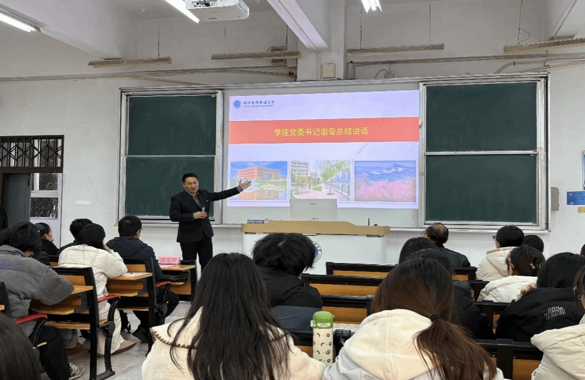 图1:学院党委书记谢奇在大会上勉励广大同学