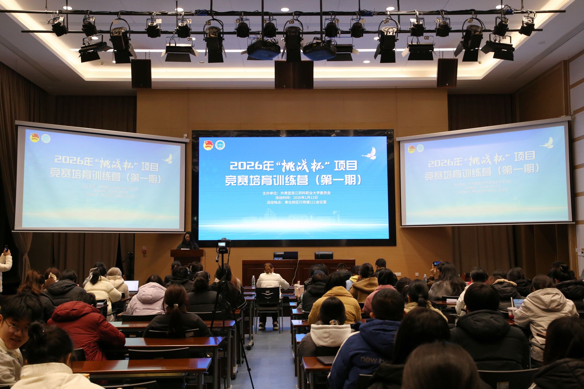 为积极备战2026年“挑战杯”大学生创业计划竞赛,持续培育优秀创新创业项目,提升参赛项目整体水平,1月12日晚,学校在奉化校区行政楼111会议室举办2026年“挑战杯”大学生创业计划竞赛首期项目训练营。校团委全体成员、各学院分团委书记、项目指导老师、进入校赛决赛的32支项目团队及学生代表等200余人参加活动,活动由校团委教师王炜主持。