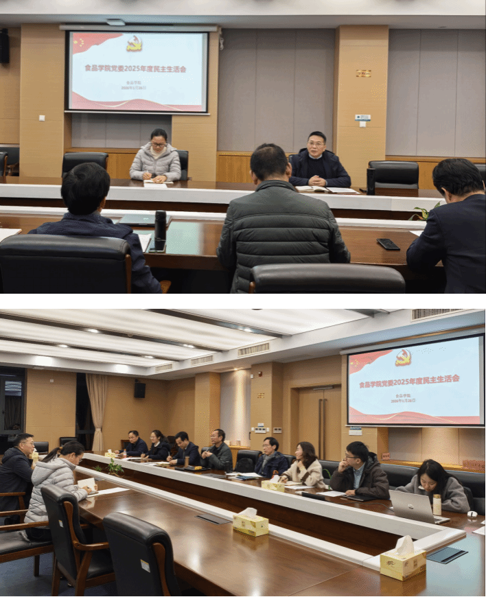 根据学校党委统一部署,1月26日晚,食品学院党委在行政楼315会议室召开了2025年度民主生活会,学院联系校领导、副校长沈忠华到会指导并作点评讲话。会议由学院党委书记陈坚主持,学院领导班子、学院党委成员参加会议,校纪检监察室副主任徐新梅出席会议。