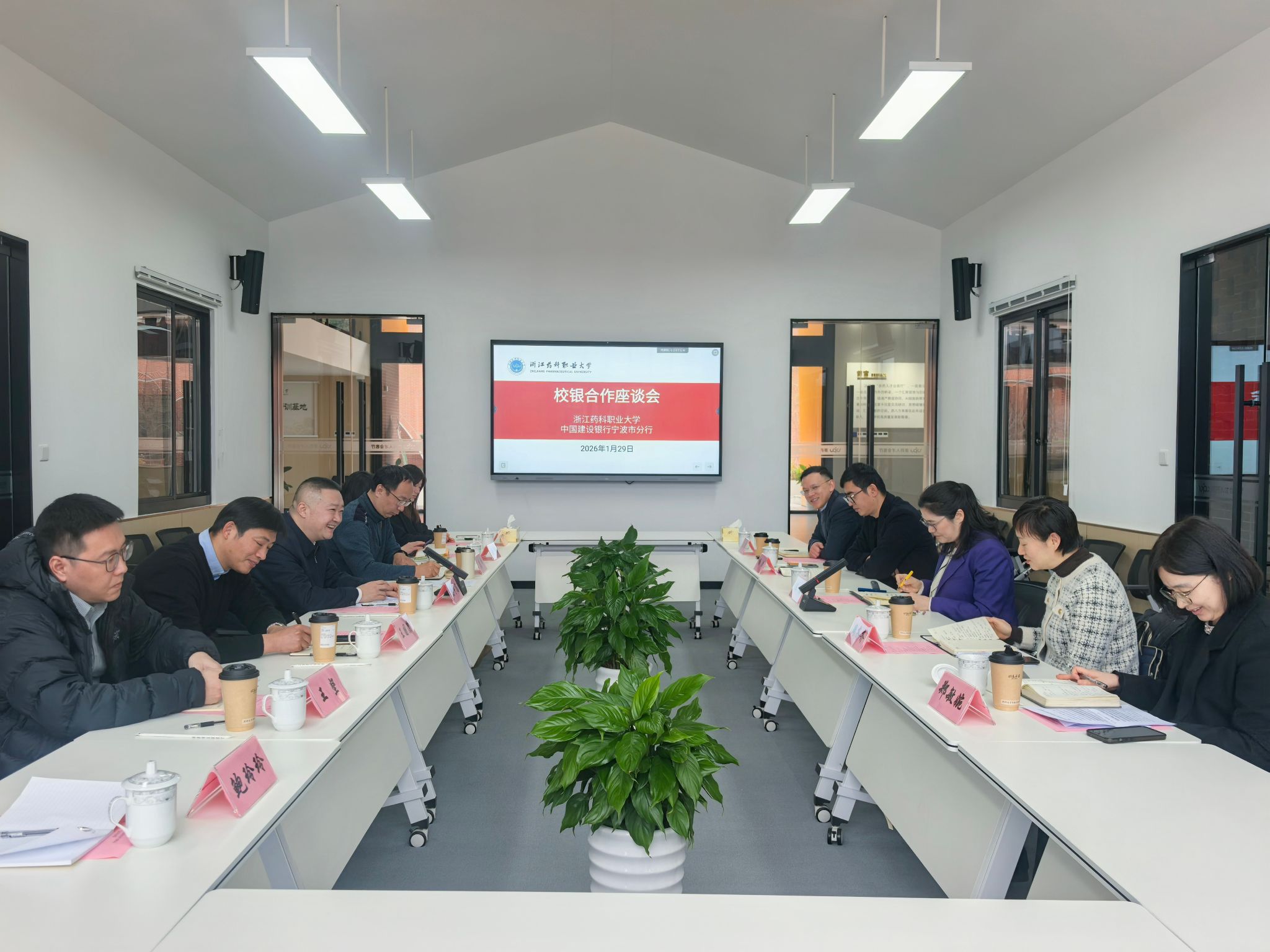 2026年1月29日上午,建行宁波市分行副行长陈路一行来校洽谈校银合作事宜。副校长姜宇国出席会议,办公室、计财处、产教融合和社会合作处、数字与信息中心等职能部门负责人参加座谈。