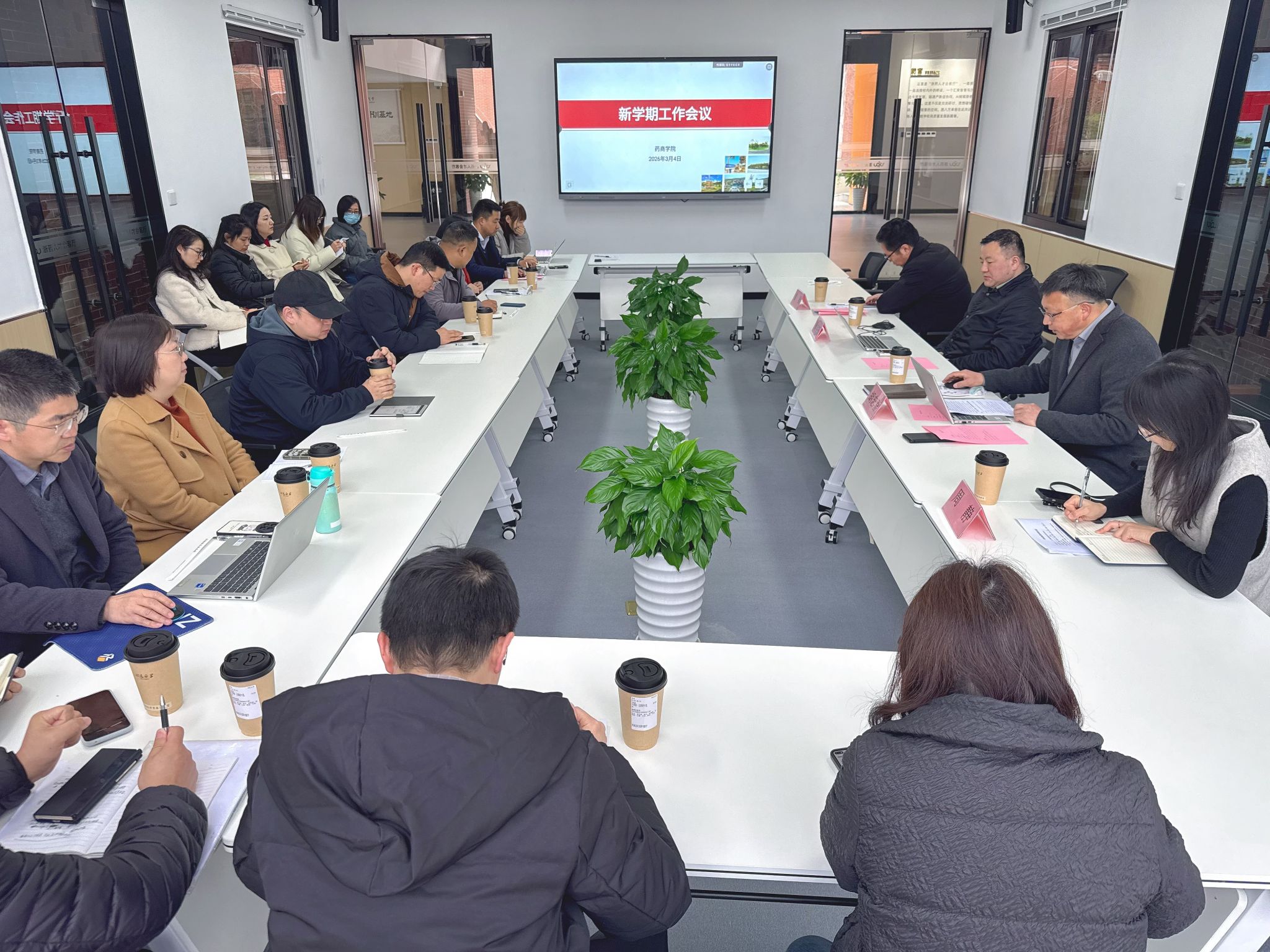 3月4日上午,药商学院在奉化校区人才会客厅召开新学期工作会议,会议由药商学院党委书记胡忠喜主持,学院院长周宇升、学院党委副书记章梁、学院副院长周静及教研室主任、专业负责人、科研团队负责人、青年博士等参加了会议。