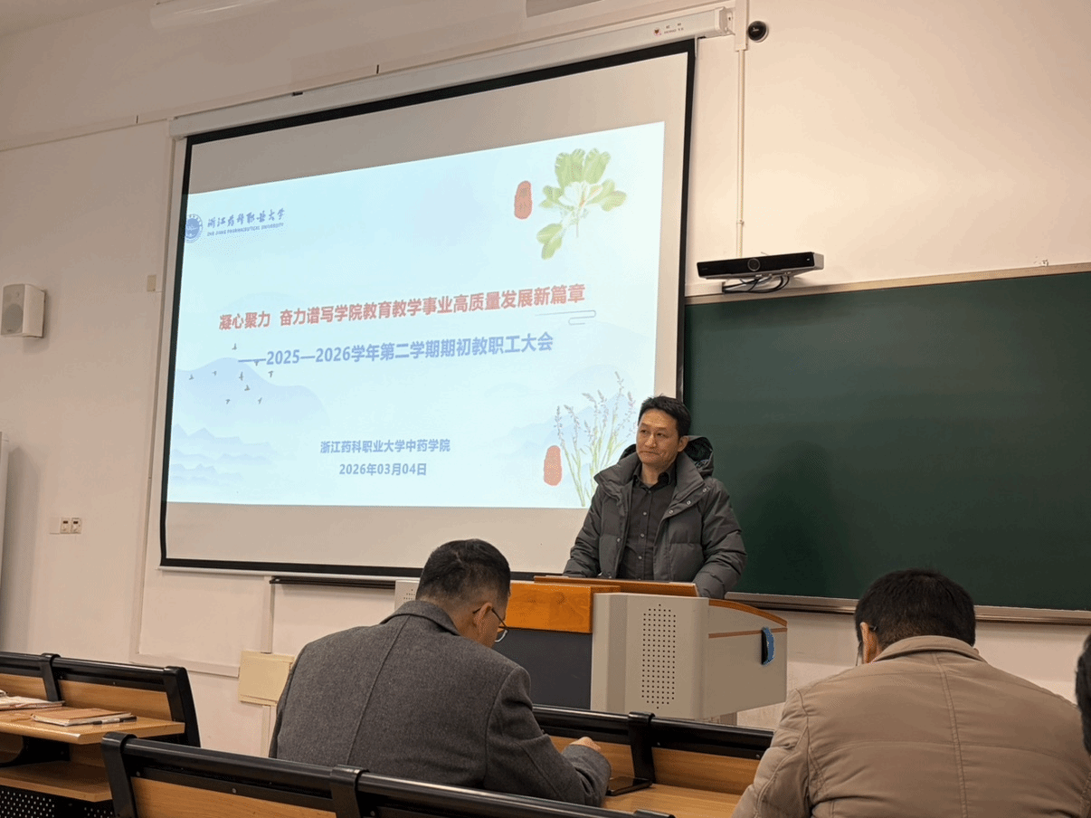 会上,谢奇传达了浙江省教育工委、教育厅2026年工作要点。谢奇强调,学院上下要以工作要点为目标指引,奋力抢抓国家职业教育创新发展与中医药高质量发展的政策机遇,以高水平学科团队和师资队伍建设为牵引,扎实推进产教深度融合和课堂教学质量提升等突出问题;要进一步强化专业社会服务能力,下好终身学习教育“先手棋”;要充分发挥学院党建的政治红利和品牌优势,努力在做优、做强党建品牌工作上展现中药学院的特色优势。
