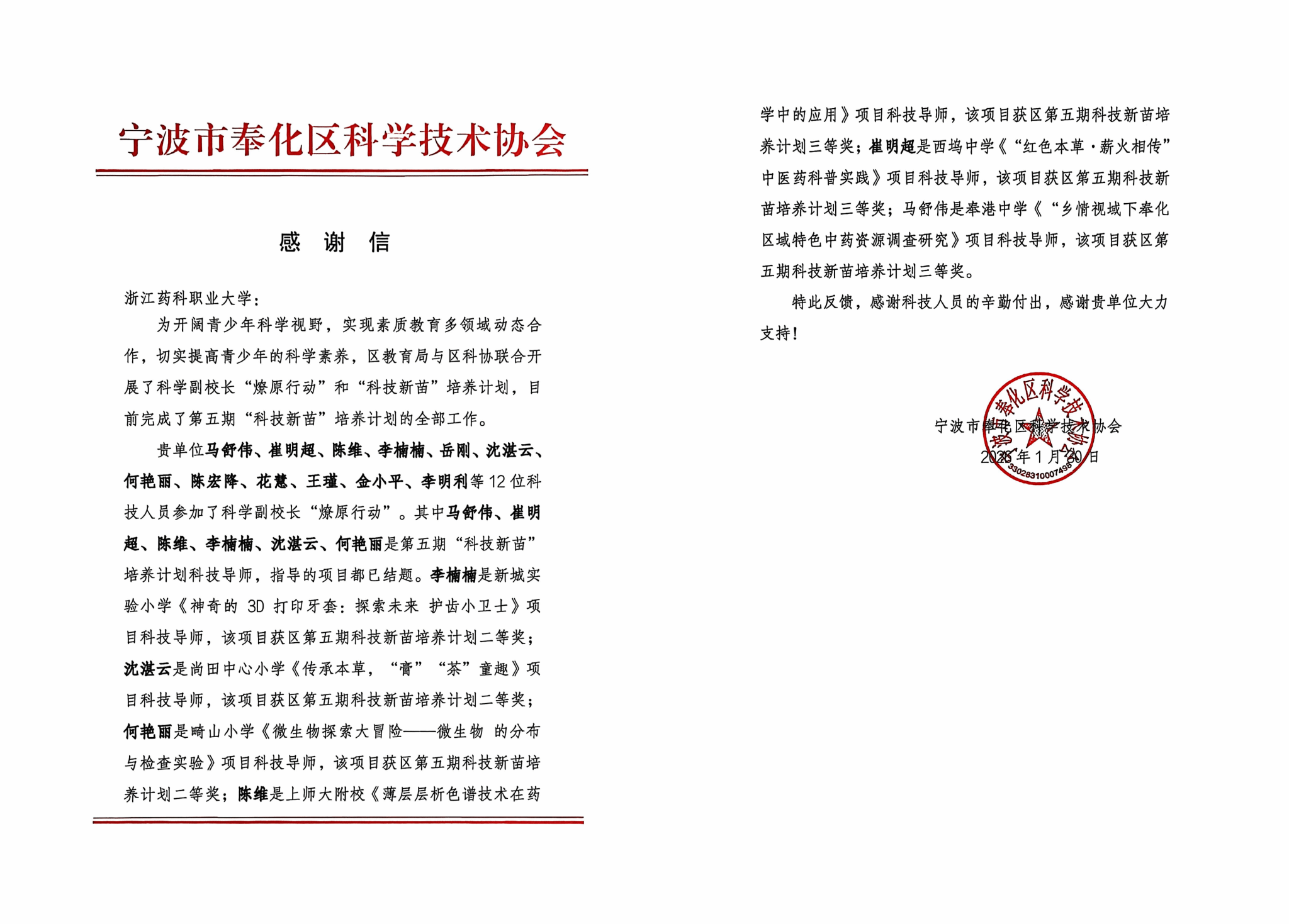 3月12日上午,奉化区科协副主席周委峰一行来访我校开展交流座谈,感谢我校在区教育局与区科协联合开展的科学副校长“燎原行动”和“科技新苗”培养计划工作中给予的大力支持及为奉化区中小学科学教育所做出的优秀贡献,并为我校在第五期“科技新苗”培养计划中表现突出的获奖教师颁发荣誉证书。科研处、“科技新苗”培养计划教师代表参加会议。