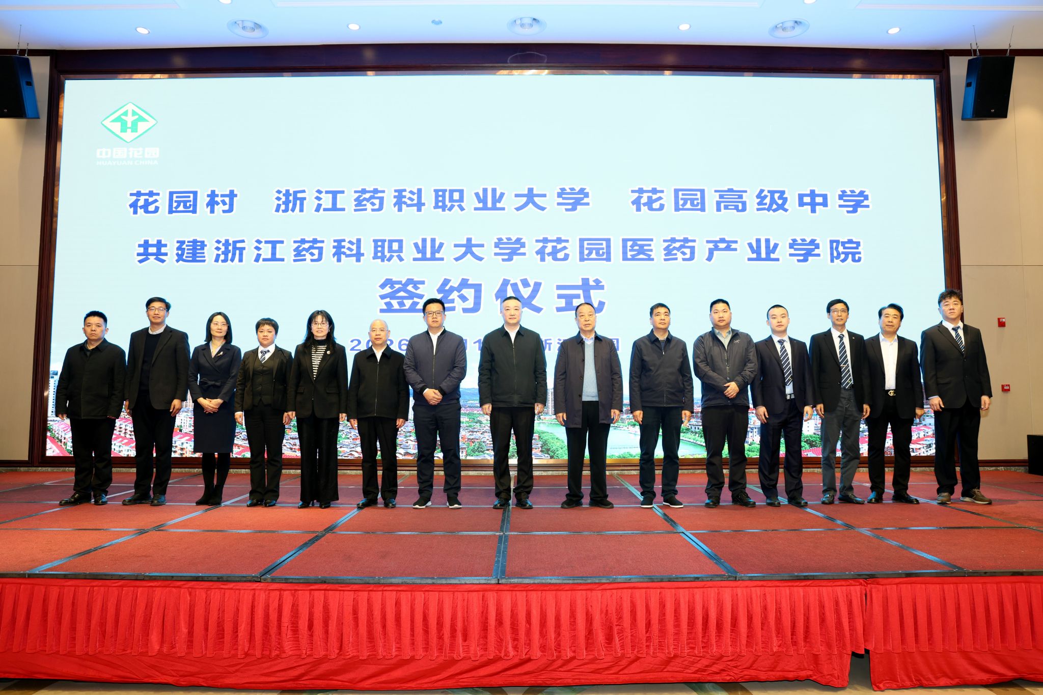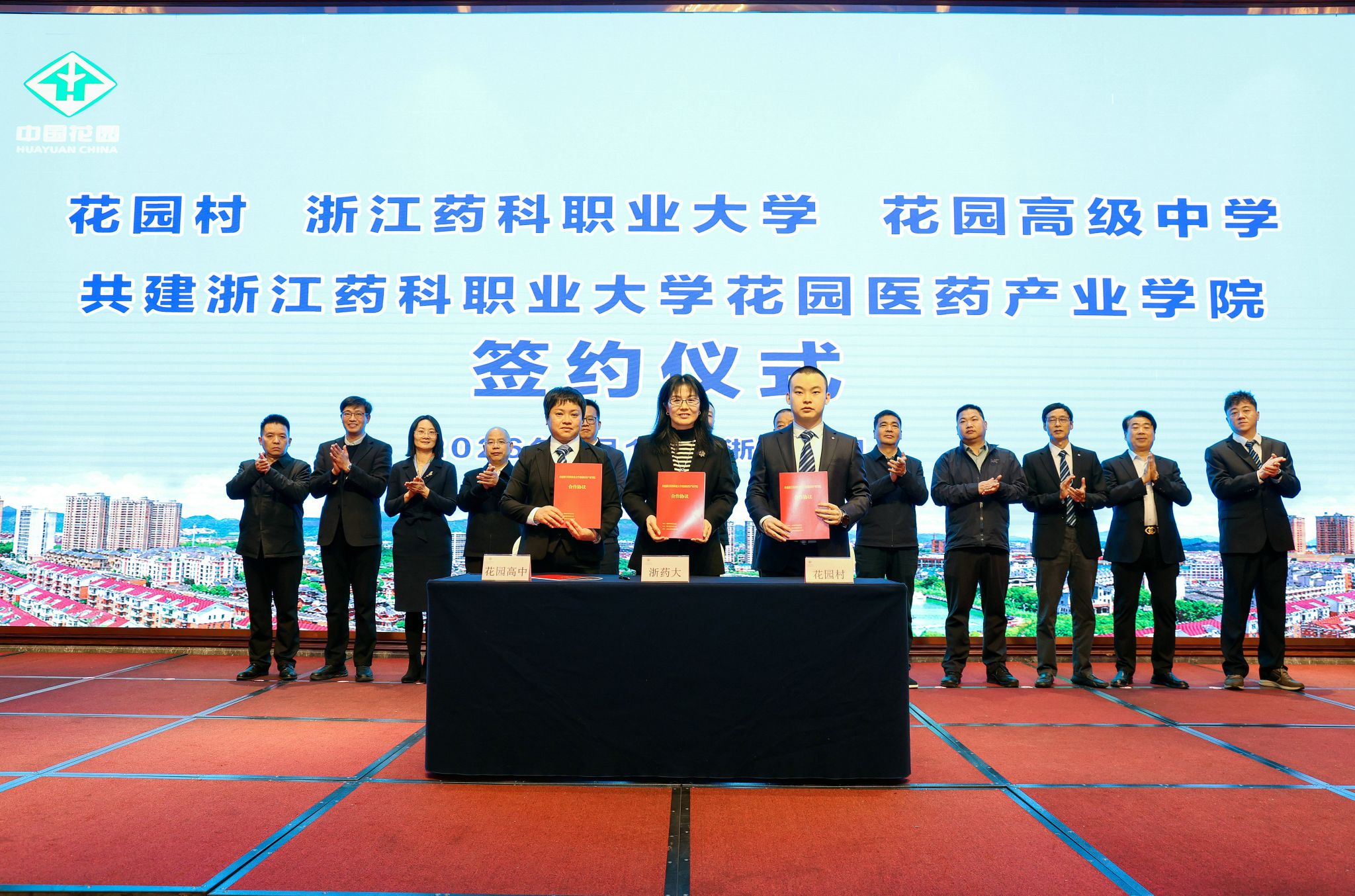 在与会嘉宾的共同见证下,浙江药科职业大学药学院院长胡英与花园村党委书记邵鸿轩、东阳花园高级中学校长何静霞共同签署合作共建协议。姜宇国与邵钦祥共同为“浙江药科职业大学花园医药产业学院”揭牌。