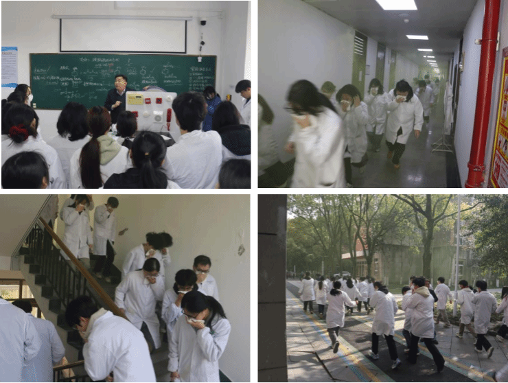 14时45分,全体参演人员准时签到就位,校安全保卫部老师开展消防安全知识培训,详细讲解疏散路线与注意事项。15时整,随着演练总指挥下达启动指令,模拟火警烟雾在2#实验楼6楼释放,演练正式拉开帷幕。