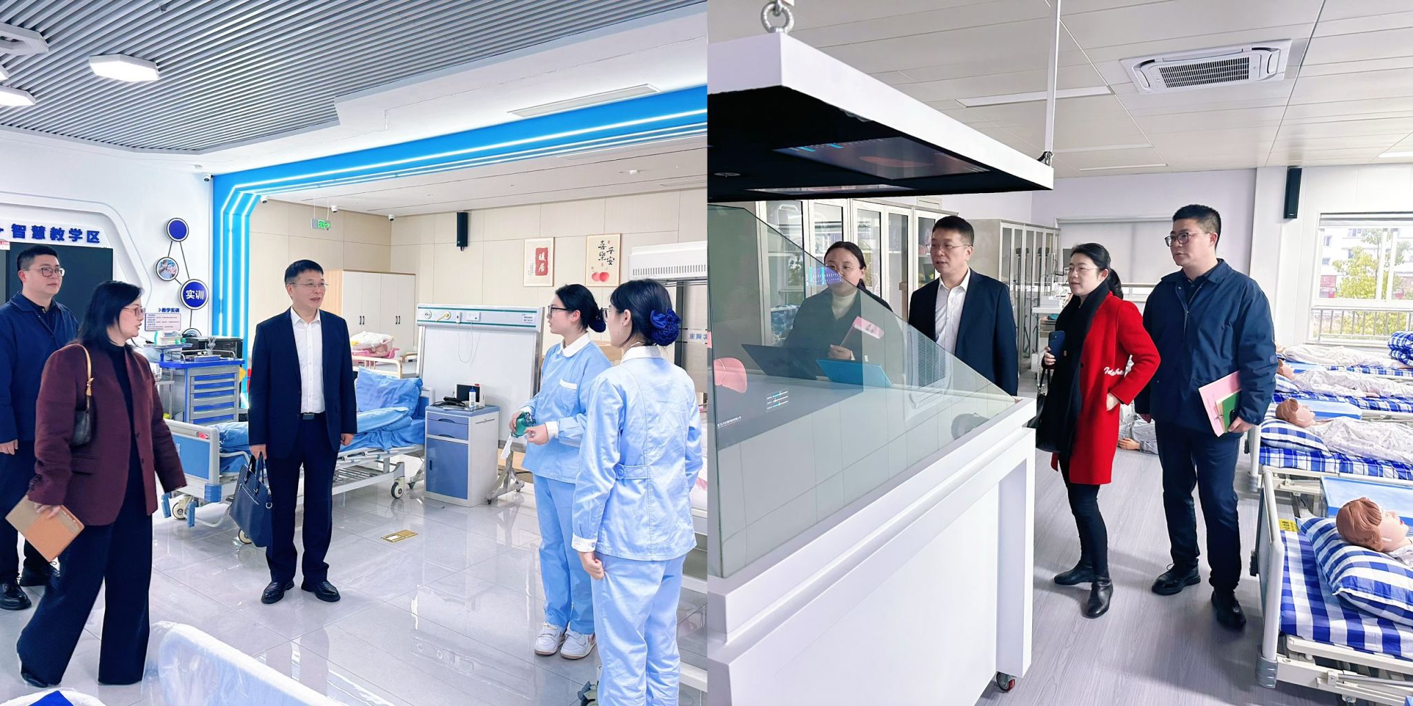 随后,沈忠华一行实地参观了护理专业实训场所,重点考察了虚拟仿真实训室、基础护理实训室及智慧康养实训室等教学设施,对学校的实训设备及浓厚的护理文化氛围表示充分肯定。