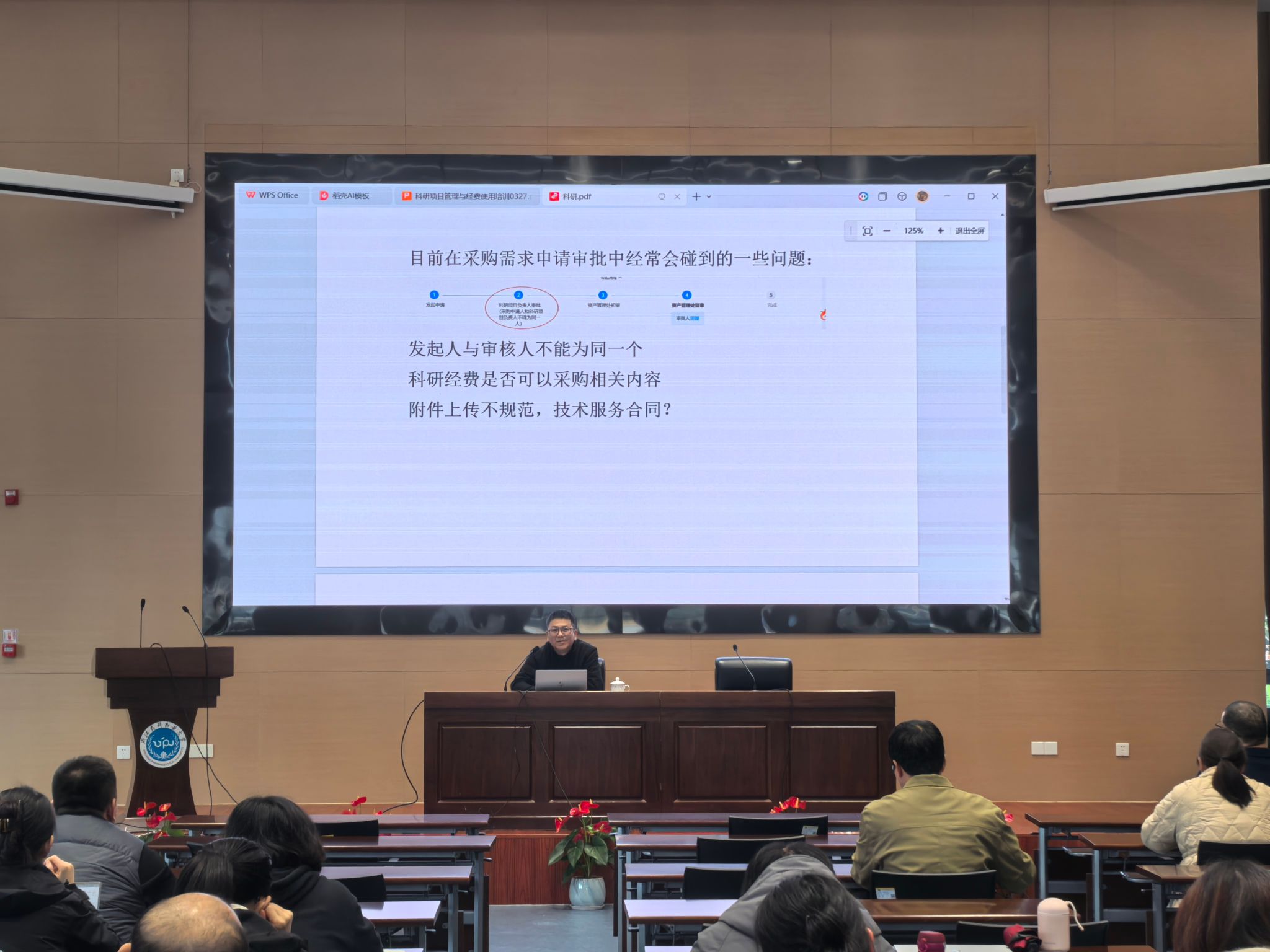 会上,资产处副处长周磊聚焦科研采购,明确其范围、流程及审批权限,说明采购标准,梳理流程不规范、资质审核不严等常见问题,提出相关解决方案,并强调需规范采购行为、防范风险。