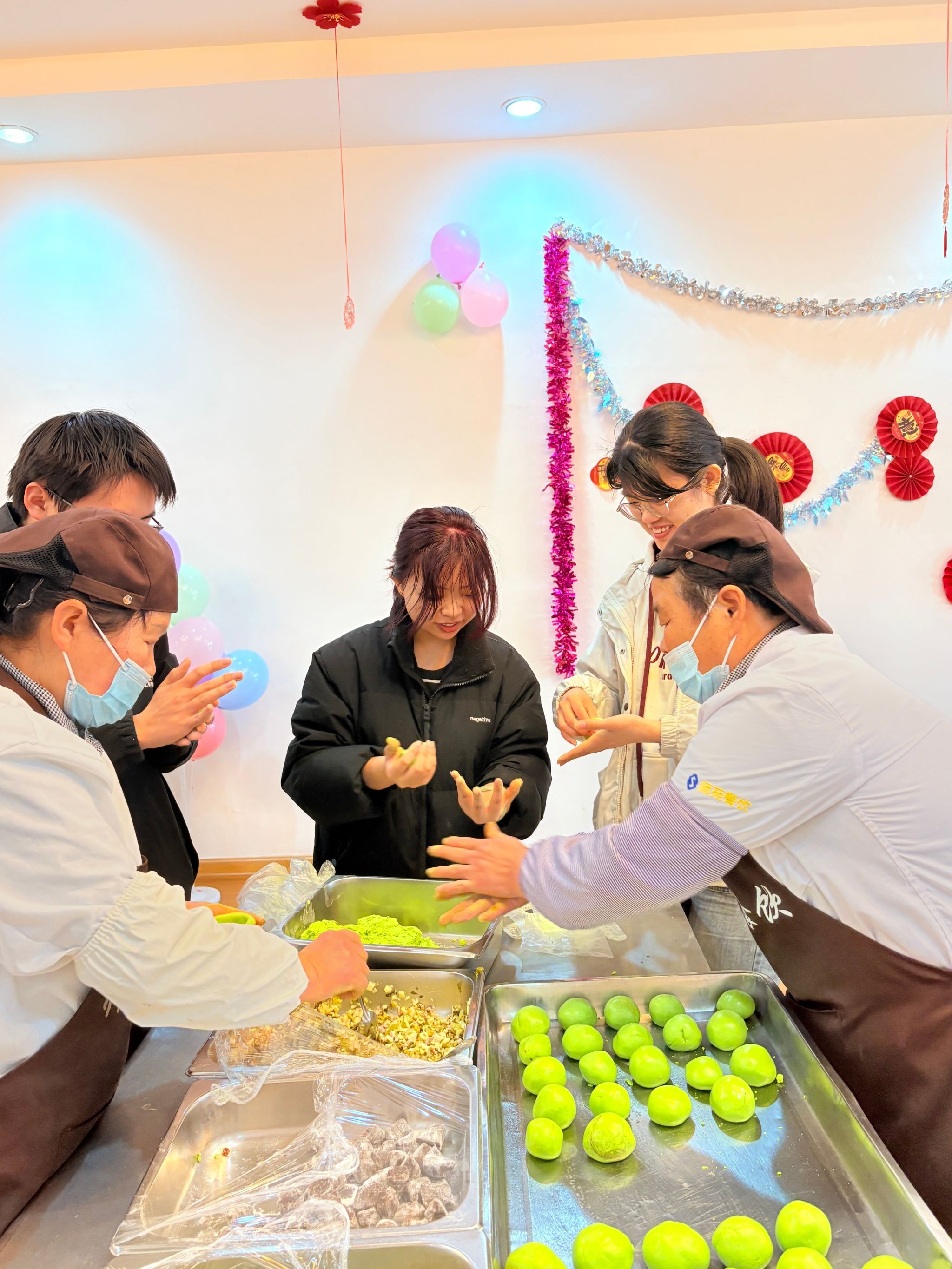 活动现场暖意融融,备料区食材整齐陈列,翠绿艾草泥、柔韧青皮面团、丰富馅料一应俱全。活动正式开始后,师生们围坐协作,开启一场春日里的手工创作。在食堂师傅的指导下,大家从手法生疏逐渐变得熟练从容:揪取青皮面团讲究分量均匀,压制皮坯需把控厚薄适中,填入馅料要精准控制用量,捏造型体则需耐心细致。
