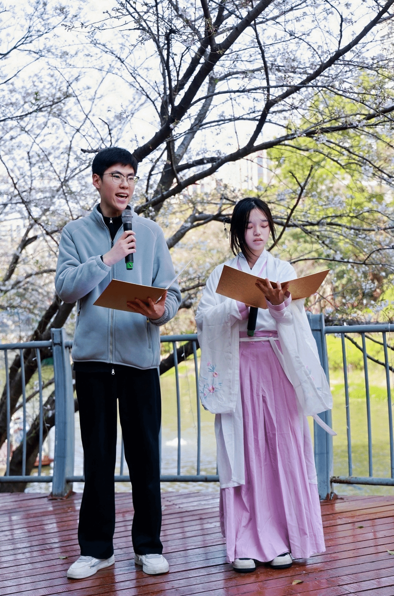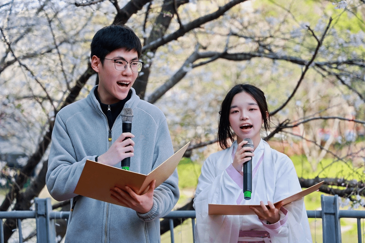 春和景明,拥有“全国文明社区”称号的钟公庙街道金色水岸社区,于3月28日下午举办了 “金色春日颂”樱花树下的原创诗歌朗诵会。该社区作为马克思主义学院的共建单位,A25药学6班鲍雨萱、陈禹帆在马克思主义学院刘玲副院长的带领下,参与了原创诗歌朗诵活动。