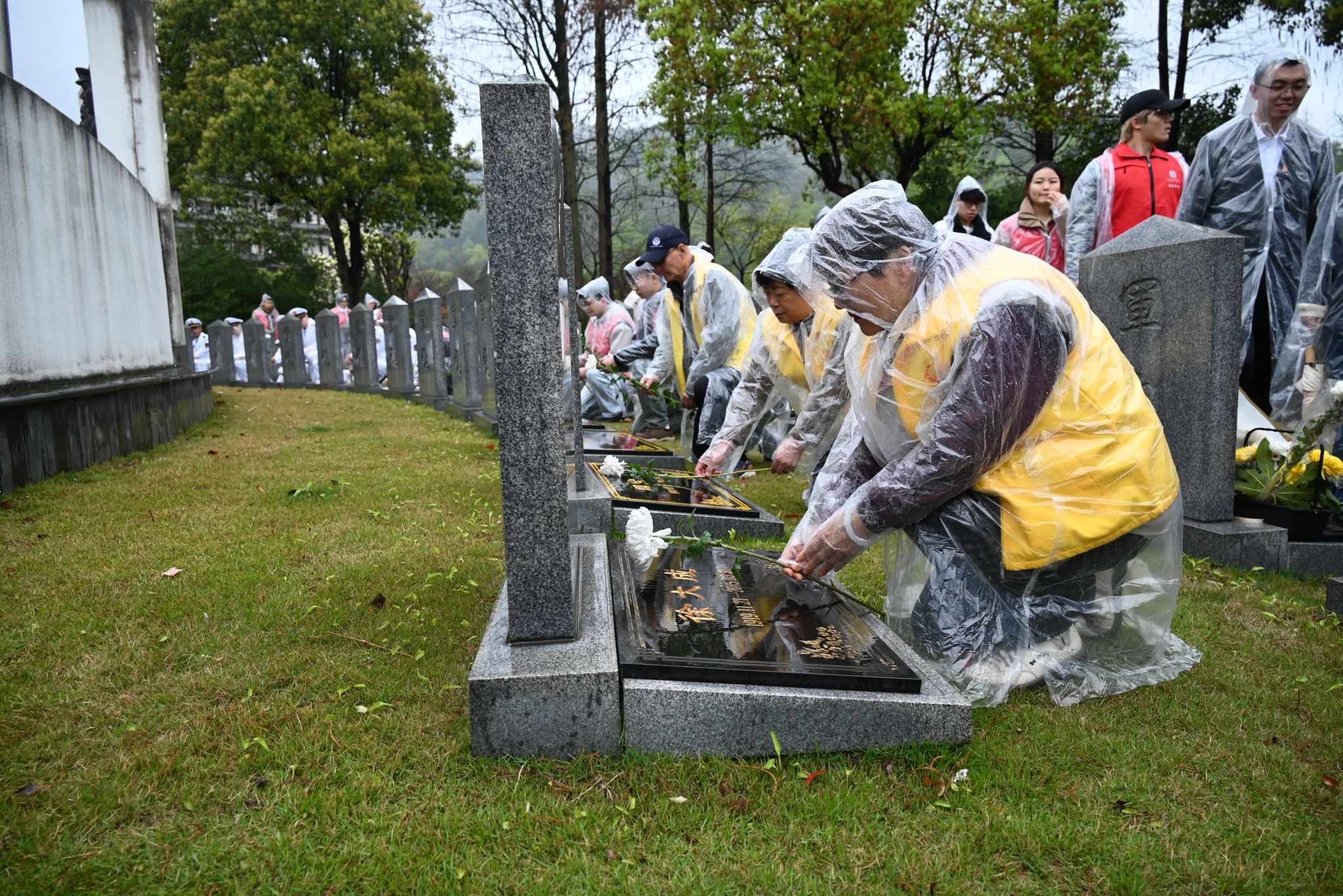 在献花环节,现场全体人员手持白菊,缓步走向老兵墓区,逐一俯身献花、驻足致意。一个个深深的鞠躬,一次次深情的凝视,表达了青年一代对抗战先辈最崇高的敬意。