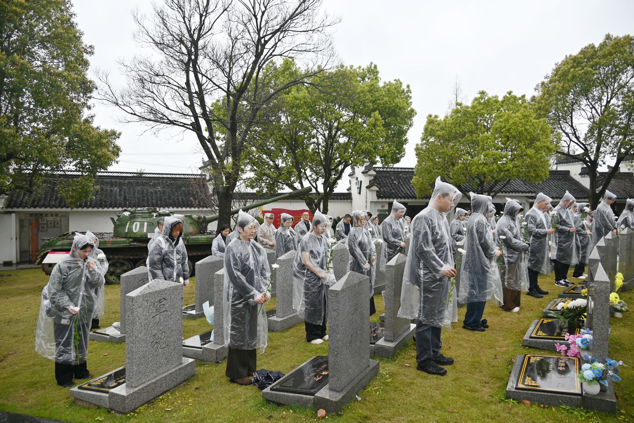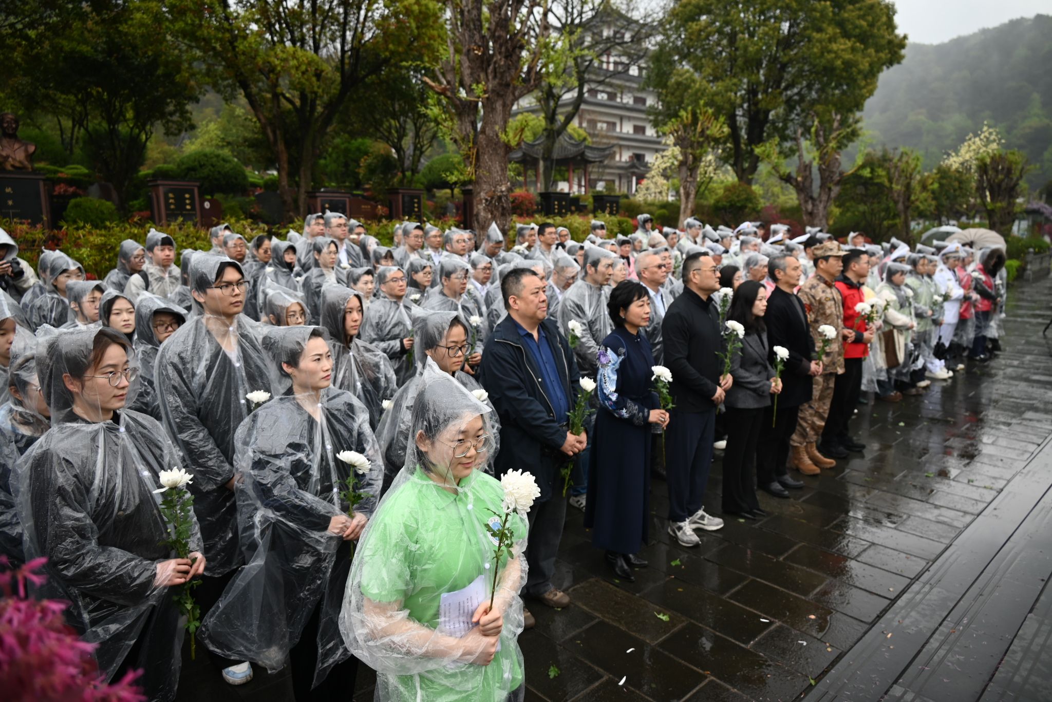 纪念园内苍松肃立,气氛庄重。全体人员整齐列队,在奏唱国歌后集体默哀,并向抗战英烈敬献花篮、行三鞠躬礼,深切缅怀为民族解放事业英勇献身的革命先辈。