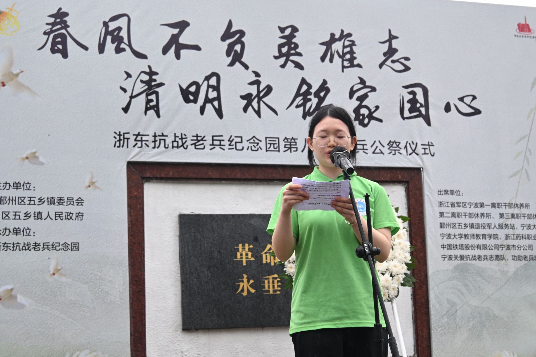 仪式上,国家级主任播音员、鄞州广播电视台资深新闻主播姜琴女士深情朗诵《不朽》。她字字铿锵、声声动容,将那段烽火岁月中英雄儿女的赤胆忠心娓娓道来,令在场每一位师生深受感动。随后,我校学生代表张俊洁同学上台发言,铿锵的话语中饱含着新时代青年铭记历史、传承精神、勇担使命的坚定决心。