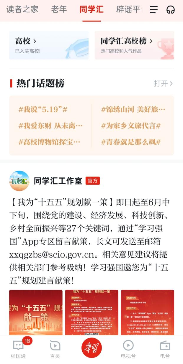 据统计,截至目前,全国有380多所高校申请入驻同学汇,覆盖全国29个省区市,吸引了数十万青年学生加入。每月发布一期同学汇高校热度榜,每期有50所高校和200件不同形式的作品上榜。同学汇已研发上线话题、心理咨询等130多项新功能、新应用,为高校宣传思想工作提供了一条“强国路线”。