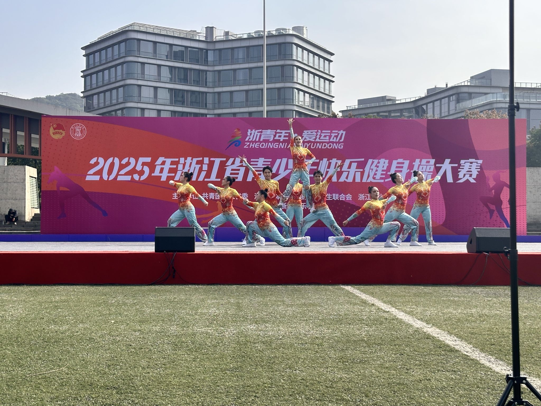 11月2日,由共青团浙江省委、浙江省体育局、浙江省学生联合会、浙江省少工委联合主办的“浙青年·爱运动”2025年浙江省青少年快乐健身操大赛在浙江音乐学院圆满落幕。我校操舞队在张倩倩老师指导下,携原创健身操剧目《我愿全速奔向你》,与来自全省近50支高校代表队同场竞技,最终成功跻身全省八强。