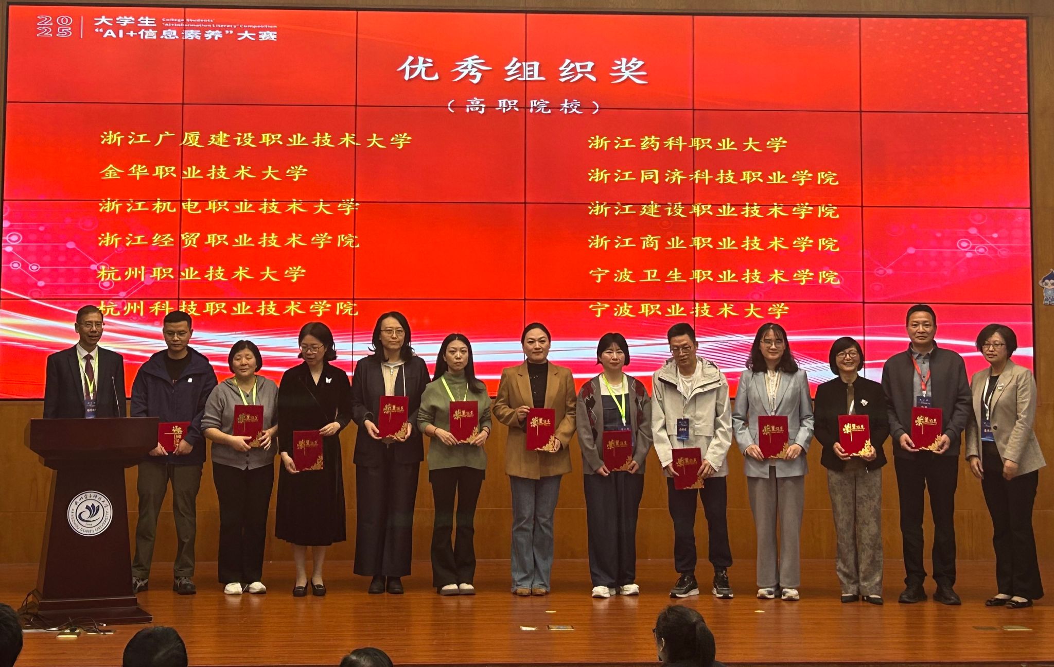 11月15日,由浙江省高等学校图书情报工作指导委员会主办,杭州电子科技大学图书馆与浙江药科职业大学图书馆联合承办的2025年大学生“AI+信息素养”大赛浙江赛区决赛,在杭州电子科技大学下沙校区圆满落幕。本次大赛汇聚了全省73所高校的顶尖队伍同场竞技,竞争激烈。作为高职赛道的承办单位,浙江药科职业大学图书馆凭借出色的组织协调能力与专业服务水平,为大赛顺利举办提供了有力保障,并在赛事中荣获“优秀组织奖”。