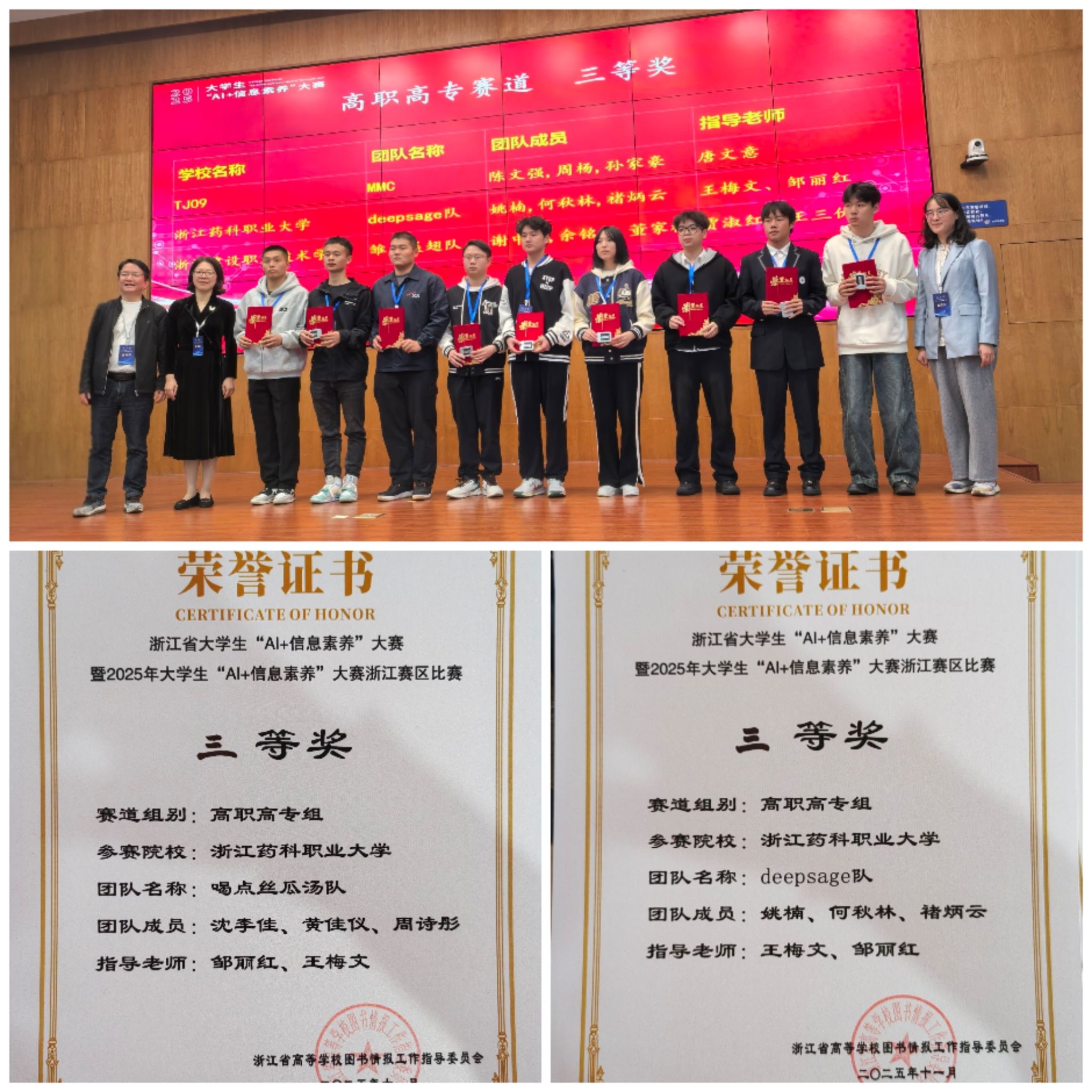 以赛促教,以赛促学。此次优异成绩的取得,是对我校信息素养教育工作成效的一次重要检验。展望未来,浙江药科职业大学图书馆将继续坚守育人初心,持续推进信息技术与教育教学的深度融合,助力学生成长为具备高水平信息素养与创新能力的新时代人才,为学校高质量发展注入源源不断的智慧与动能。 (邹丽红供稿)