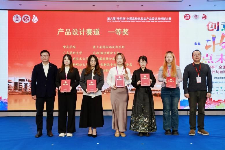本届“华灼杯”以“创意‘妆’点未来”为主题,聚焦化妆品行业的产品创新与设计实践。赛事历经报名、初赛、复赛等多轮激烈角逐,最终共有36支产品设计精英队伍晋级上海总决赛。历时9个月的深耕细研,层层角逐,浙药学子凭借扎实的专业功底、卓越的创新思维与出色的实践能力,从全国134支高校参赛队伍中脱颖而出,一举斩获大赛最高荣誉,创造了我校在该项赛事中的历史最佳成绩。其中,由贾艳、金小平老师指导,郑荣强、陈佳怡、吴莹露、叶浩军、郭亭亭、何如银同学完成的“珀御·雅玥肌能”系列产品,勇夺大赛特等奖,并同时摘得“自然堂”产品包装设计特等奖;由李颖芳、朱华强老师指导,钟姚莹、胡施瑜、陆思艺、杜嘉禾、季雨欣、鲍婉婷同学完成的“苜说·青刺果多效维稳精华霜”产品,荣获大赛一等奖。在强手如林的赛场上,我校两支代表队沉着自信、稳定发挥,其作品在创意构思、技术实现、市场潜力及现场答辩等环节均表现突出,赢得了评审专家与行业代表的高度认可,充分彰显了我校在高端技能人才培养与“产、学、研、创”融合方面的显著成效。