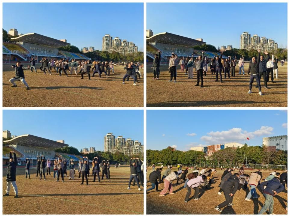 活动伊始,老师们首先在操场集合,伴随着舒缓的音乐,在体训部王德磊老师的带领下集体练习了传统健身功法“八段锦”。大家神情专注,动作整齐,在一招一式中认真感受舒展与平和,既活动了筋骨,也为忙碌的工作间隙注入了健康的活力。热身结束后,众人移步至食堂活动会场。