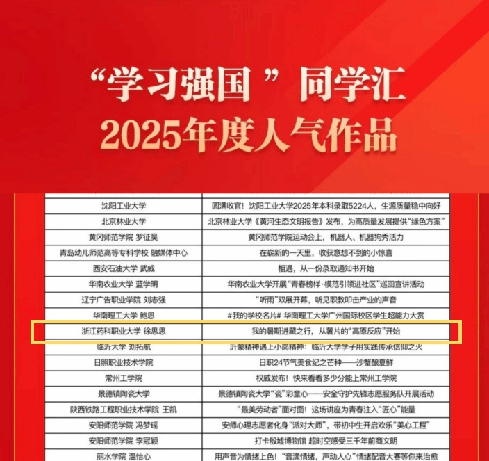 近日,“学习强国”同学汇2025年度评选结果揭晓。我校凭借优质的内容表达与创新的互动运营,蝉联“年度最具传播力高校”称号。同时,药学院徐思思同学的作品《我的暑期进藏之行,从薯片的“高原反应”开始》荣获“年度高校人气作品”,实现了我校作品在该奖项上的连续入选。