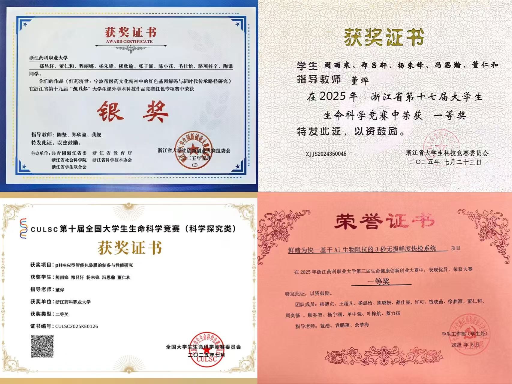 这份百分之百的严谨与自律,让他不仅收获了校单项奖学金与国家奖学金,也在全国大学生生命科学竞赛中斩获省赛一等奖、国赛二等奖,在浙江省“挑战杯”红色专项中赢得银奖。每一次获奖的背后,都是无数个百分之百投入的日夜。