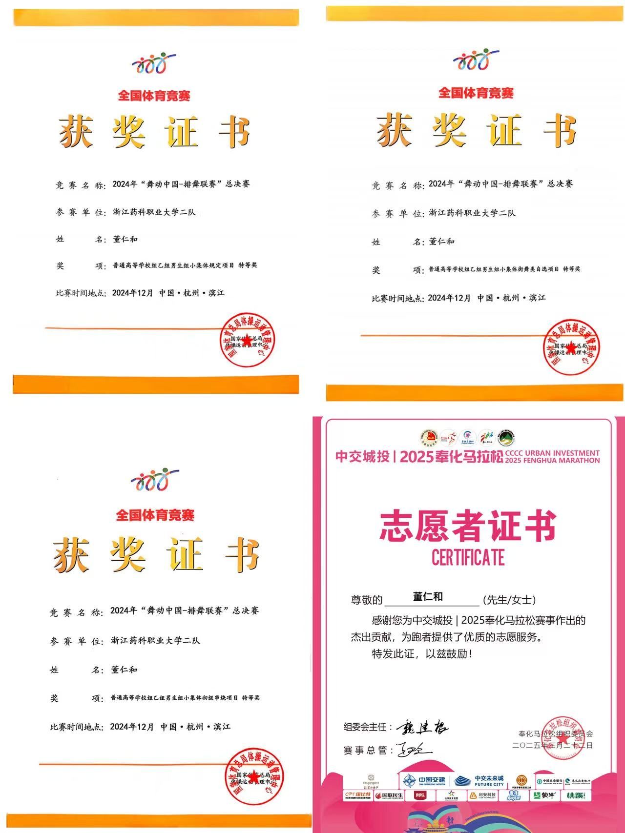 最终这份百分之百的投入也在2024年“舞动中国-排舞联赛”总决赛中结出硕果——当董仁和与队友以近乎完美的同步性完成最后一个动作时,全场爆发出热烈掌声。最终,他们凭借出色的表现一举夺得三项特等奖。“这些成绩和舞台上的成长,也让我更加坚定,只要敢尝试、肯付出,就没有什么不可能。”