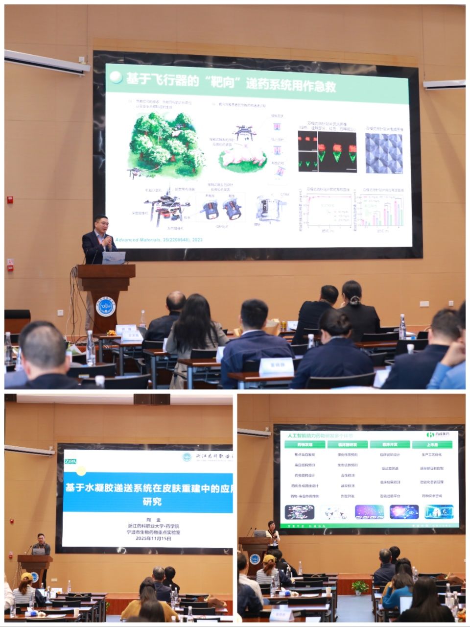 年会环节学术氛围浓厚,议程紧凑而充实。会议精心设置了三场高水平的专题学术报告与一场圆桌讨论会。首场报告由浙江大学药学院院长、求是讲席教授顾臻带来,他以《仿生智能药物递释技术》为题,深入浅出地分享了其团队在前沿药物递送系统领域的最新突破与未来展望,引发了与会者的极大兴趣。随后,杭州百诚医药科技股份有限公司董事长楼金芳女士作了题为《AI重塑医药研发新范式》的报告,她从产业视角出发,生动阐述了人工智能技术如何为传统药物研发模式带来革命性变革,提供了产学研结合的新思路。第三场报告由浙江药科职业大学药学院副教授陶金主讲,他聚焦于《基于水凝胶递送系统在皮肤重建中的应用研究》,汇报了在该细分领域的扎实研究与创新发现,展现了我校青年科研人员的潜力。