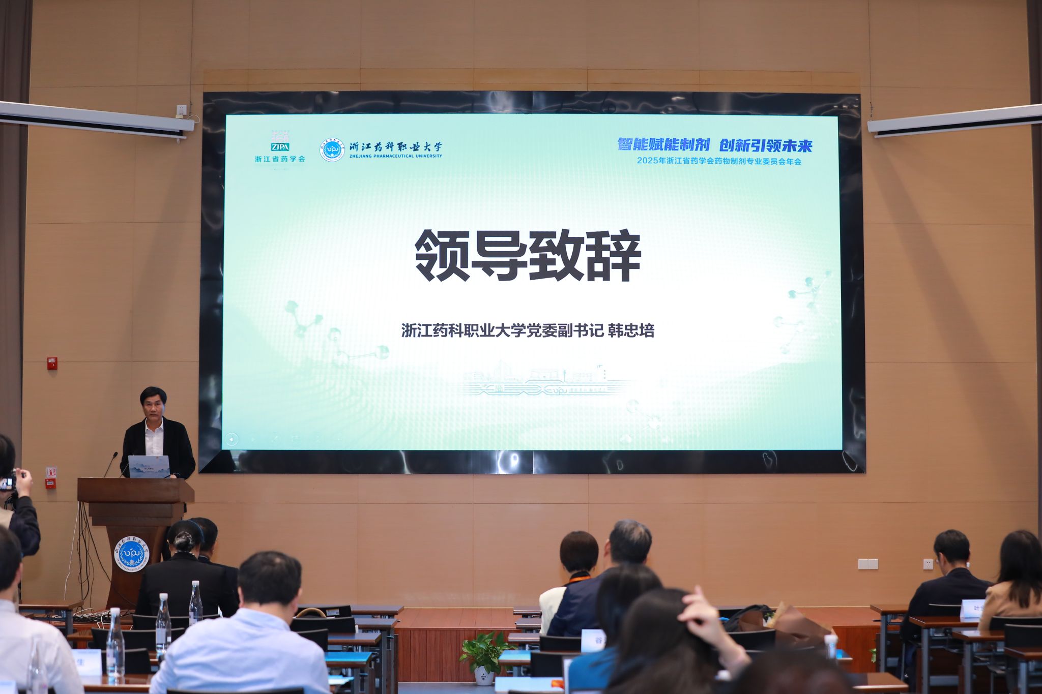 换届选举结束后,新当选的第九届委员会随即组织召开了2025年度学术年会,将会议推向高潮。浙江药科职业大学党委副书记韩忠培出席会议并致辞,他代表校方对各位专家的到来表示热烈欢迎,并强调了学术交流对于推动区域医药产业发展与专业人才培养的重要意义,预祝大会取得圆满成功。