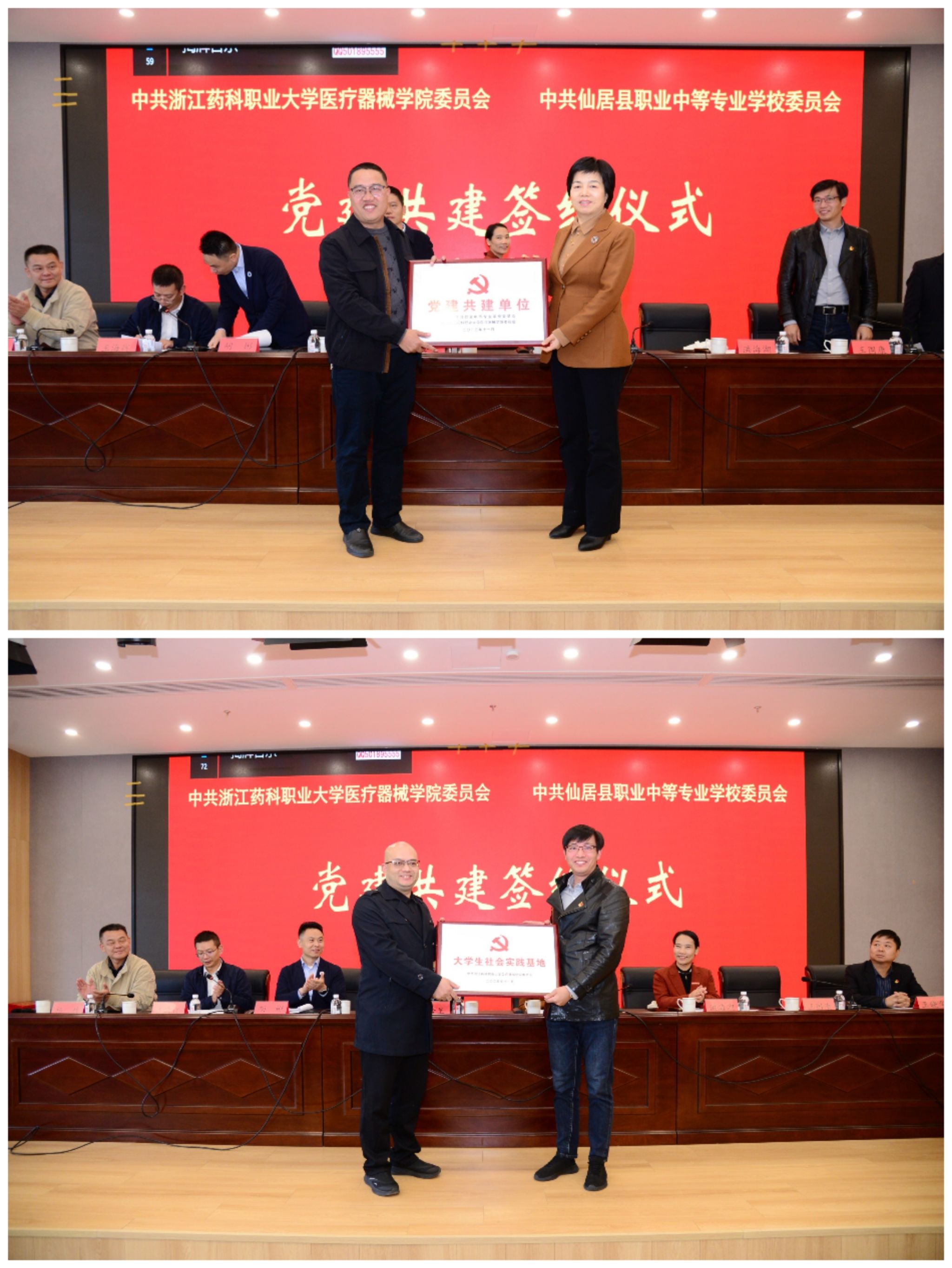 随后,在全体与会人员的共同见证下,双方举行签约授牌仪式。医疗器械学院党委书记洪海湖与仙居县职业中等专业学校党委书记王晓华共同签署《党建共建备忘录》,明确了双方在组织共建、资源联享、人才联培、活动联办等方面的合作框架。副校长许莉勇、产教融合与社会合作处负责人、仙居县职业中等专业学校相关负责人共同为党建共建合作单位、大学生社会实践基地等2个合作平台揭牌。