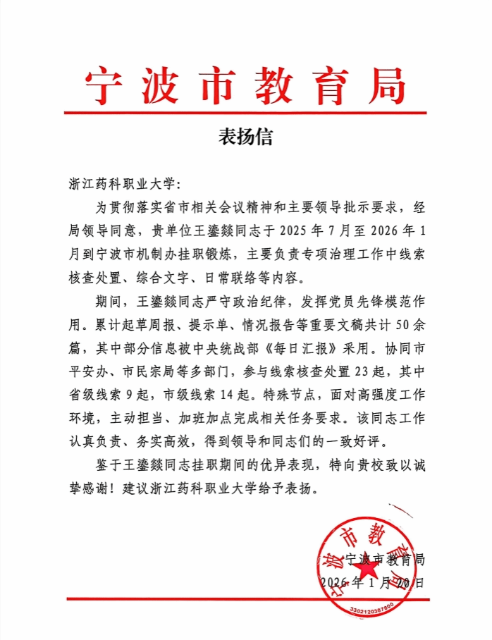 2026-01-29近日,马克思主义学院(社会科学部)收到宁波市教育局发来的一封表扬信,信中对我院选派至宁波市相关专项治理工作机制办公室挂职锻炼的王鎏燚同志的表现给予了高度评价和诚挚感谢。2025年7月至2026年1月,根据工作安排,王鎏燚同志前往宁波市教育局机制办进行为期半年的挂职锻炼。在此期间,她主要承担专项治理工作中的线索核查处置、综合文字材料撰写及日常沟通协调等关键任务。面对复杂繁重的工作内容和快节奏、高强度的工作...